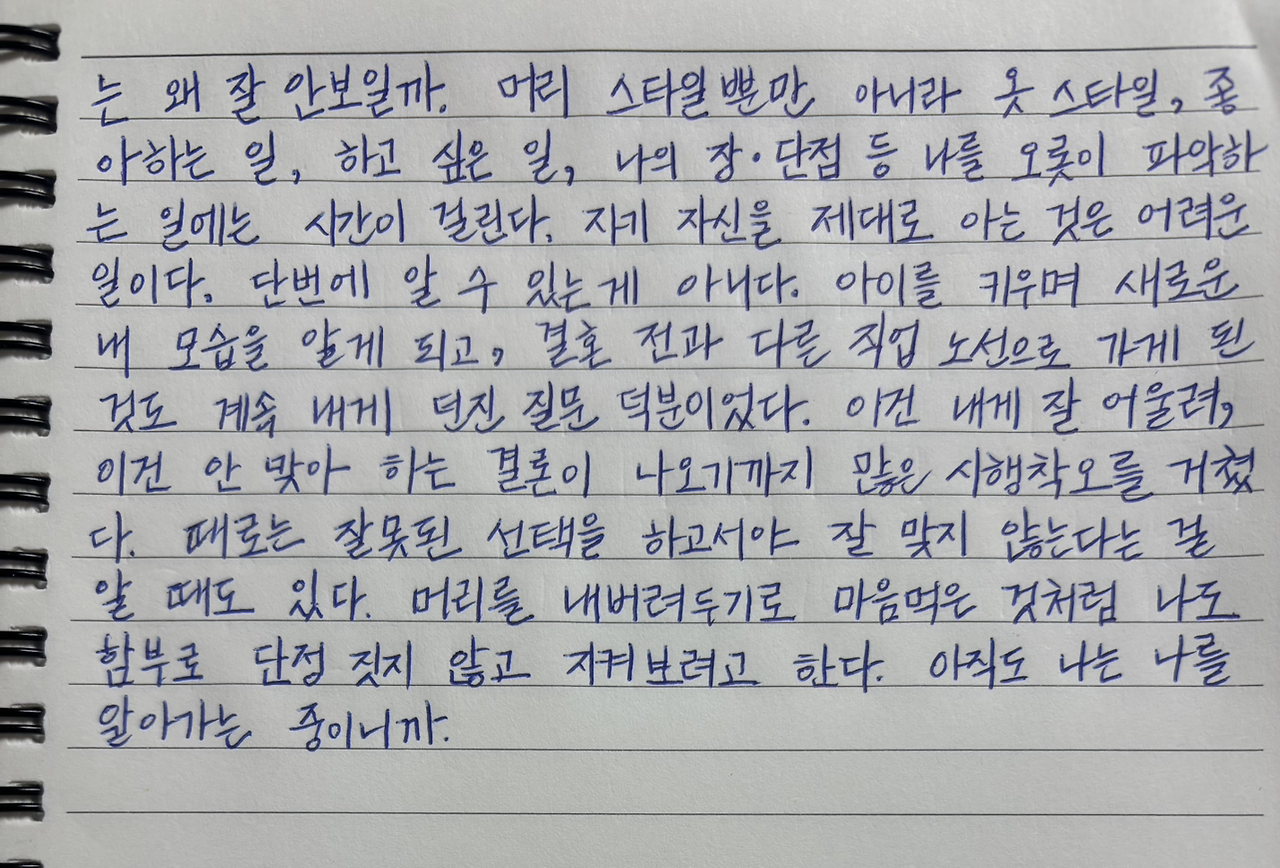 머리 스타일뿐만 아니라 어울리는 옷 스타일, 좋아하는 일, 하고 싶은 일, 나의 장·단점 등 나를 오롯이 파악하는 일에는 시간이 걸린다.