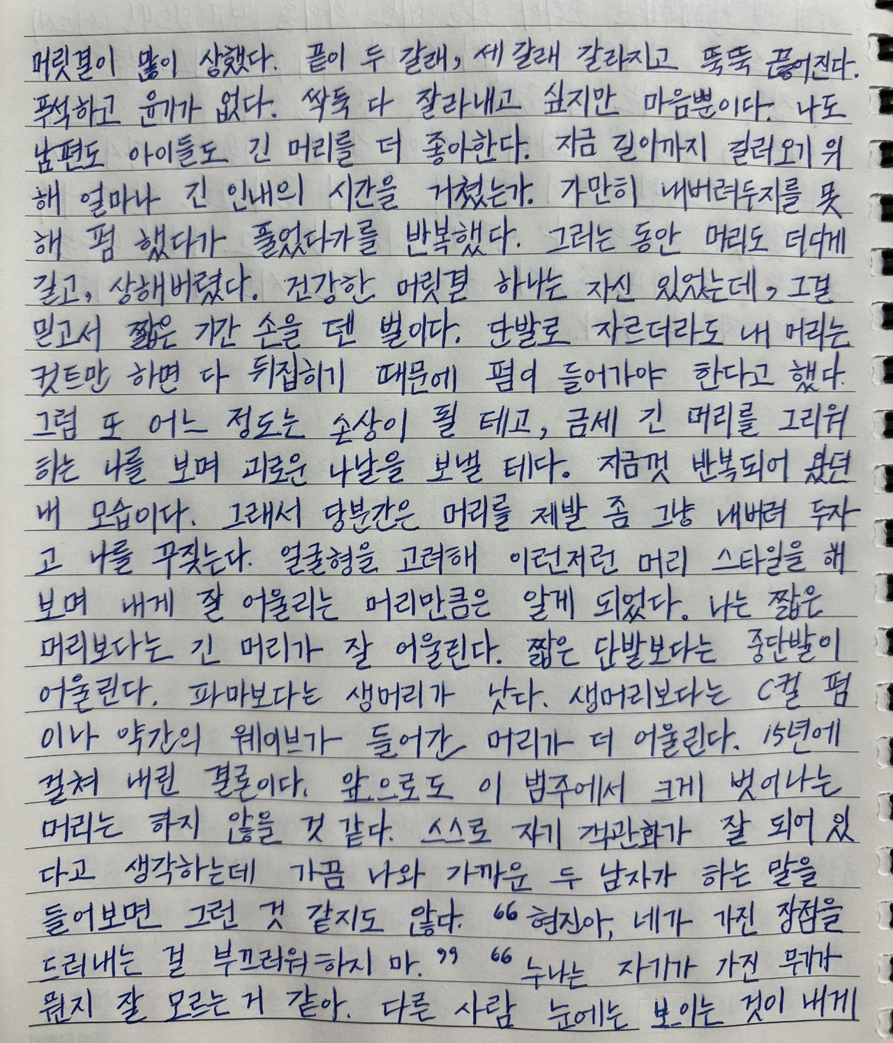 그럼 또 어느 정도는 손상이 될 테고, 금세 긴 머리를 그리워하는 나를 보며 괴로운 나날을 보낼 테다.