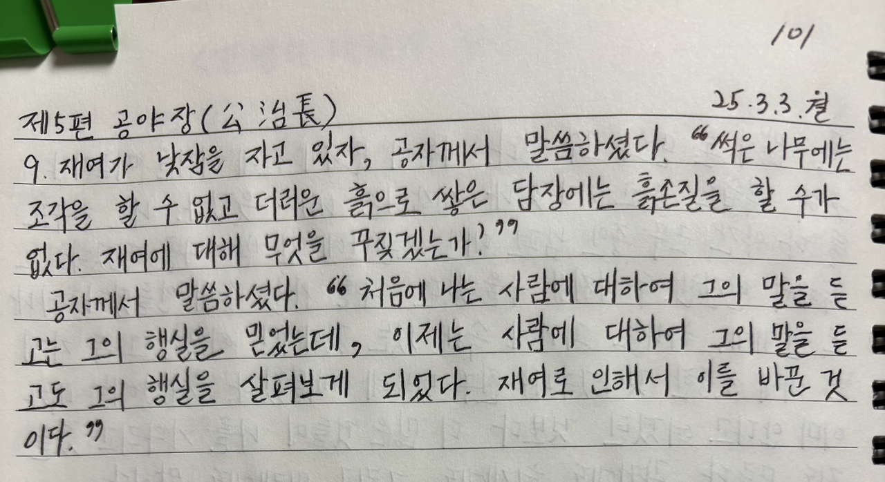 재여가 낮잠을 자고 있자, 공자께서 말씀하셨다. "썩은 나무에는 조각을 할 수 없고 더러운 흙으로 쌓은 담장에는 흙손질을 할 수가 없다. 재여에 대해 무엇을 꾸짖겠는가?"