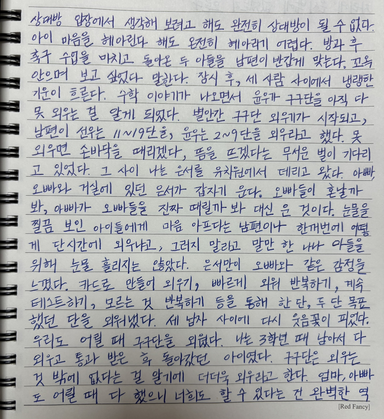 별안간 구구단 외우기가 시작되고, 남편이 선우는 11~19단을, 윤우는 2~9단을 외우라고 했다.