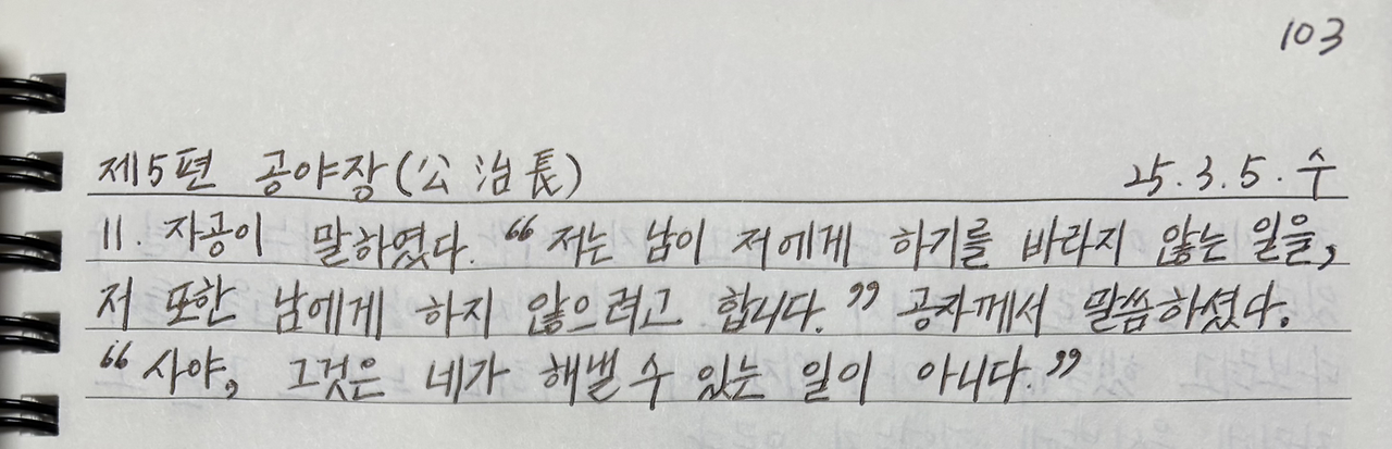 자공이 말하였다. “저는 남이 저에게 하기를 바라지 않는 일을, 저 또한 남에게 하지 않으려고 합니다.” 공자께서 말씀하셨다. “사야, 그것은 네가 해낼 수 있는 일이 아니다.”