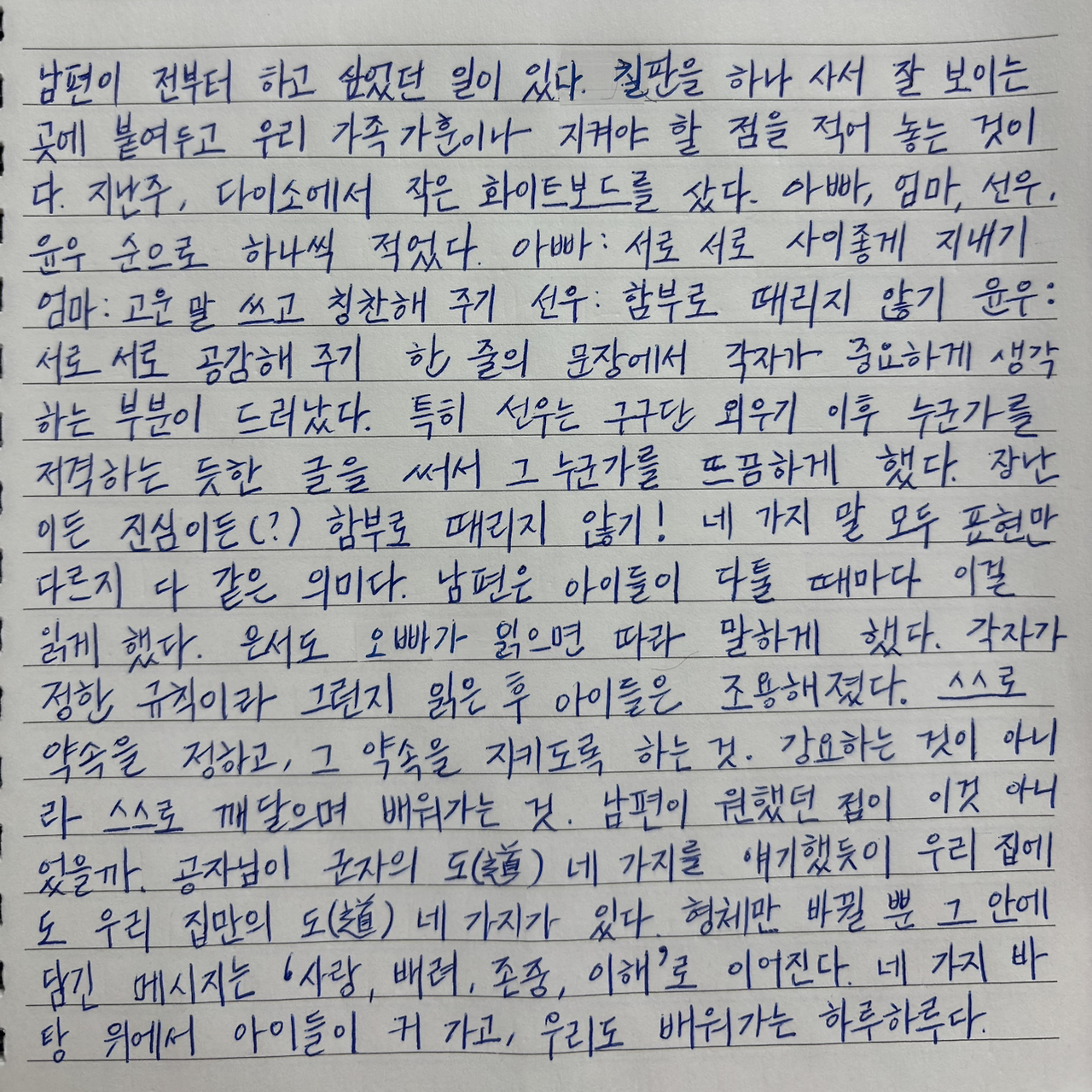 칠판을 하나 사서 잘 보이는 곳에 붙여두고 우리 가족 가훈이나 지켜야 할 점을 적어 놓는 것이다.