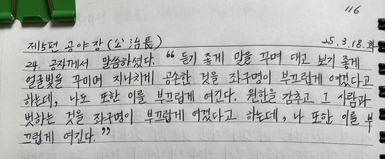 공자께서 말씀하셨다. "듣기 좋게 말을 꾸며 대고 보기 좋게 얼굴빛을 꾸미며 지나치게 공손한 것을 좌구명이 부끄럽게 여겼다고 하는데, 나도 또한 이를 부끄럽게 여긴다. 원한을 감추고 그 사람과 벗하는 것을 좌구명이 부끄럽게 여겼다고 하는데, 나 또한 이를 부끄럽게 여긴다."