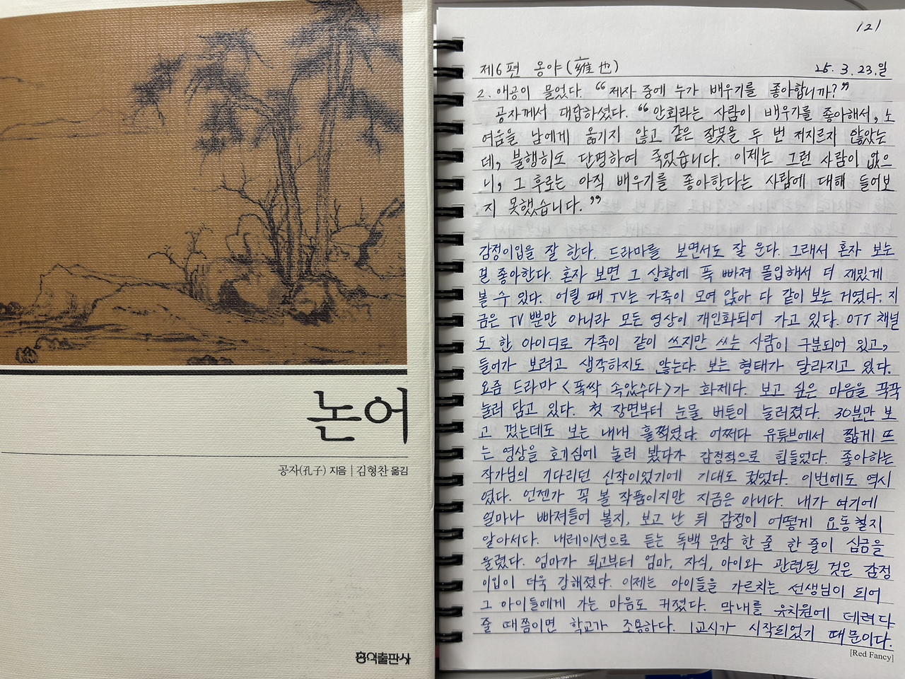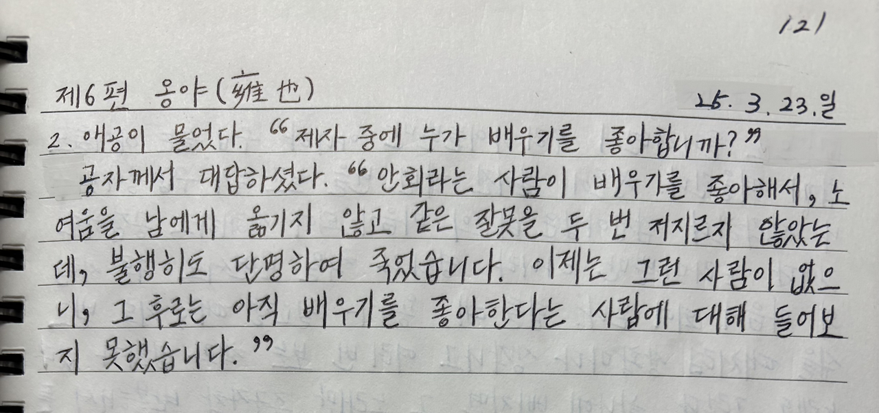 공자께서 대답하셨다. "안회라는 사람이 배우기를 좋아해서, 노여움을 남에게 옮기지 않고 같은 잘못을 두 번 저지르지 않았는데, 불행히도 단명하여 죽었습니다. 이제는 그런 사람이 없으니, 그 후로는 아직 배우기를 좋아한다는 사람에 대해 들어 보지 못했습니다."