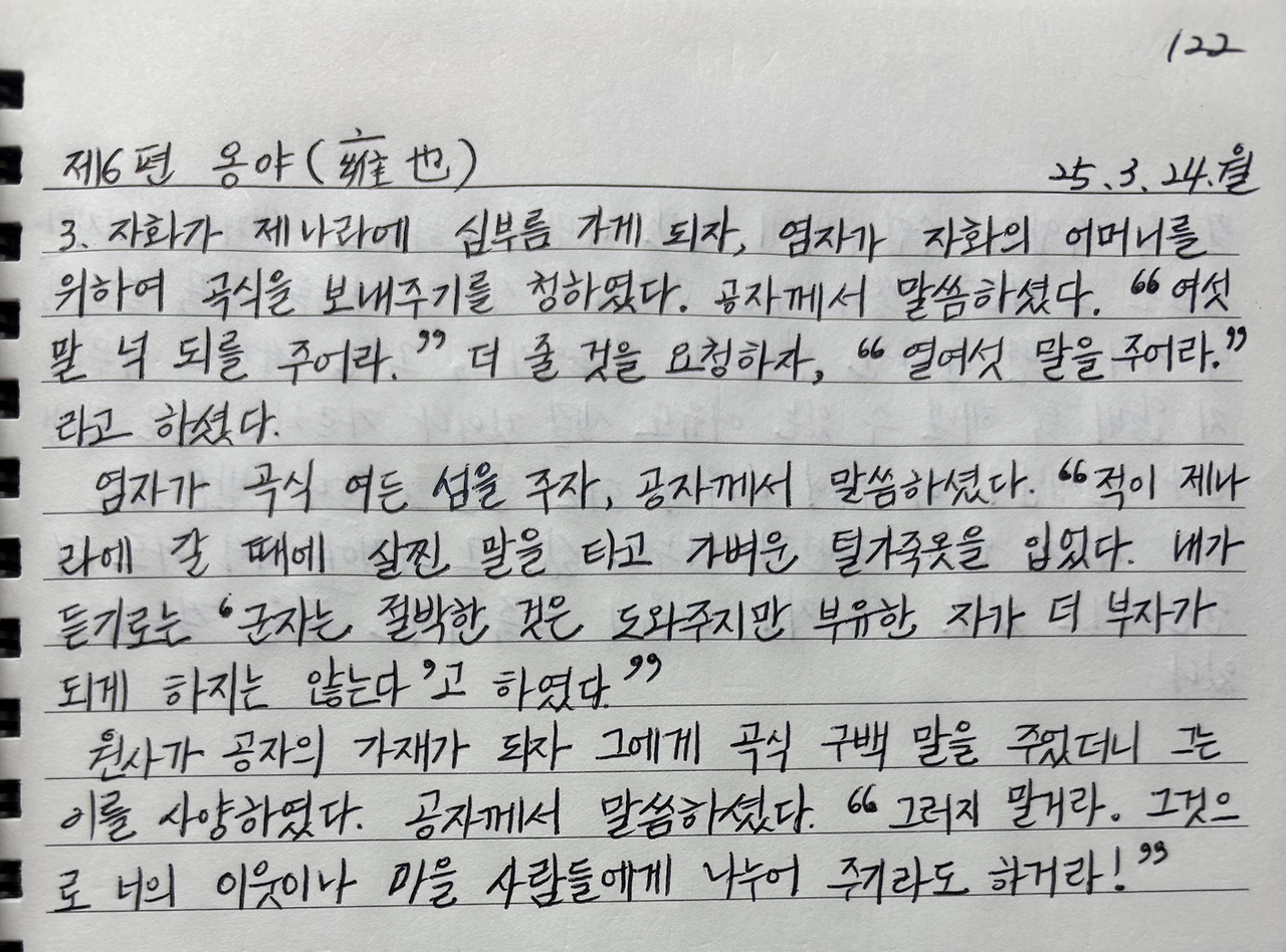염자가 곡식 여든 섬을 주자, 공자께서 말씀하셨다. "적이 제나라에 갈 때에 살찐 말을 타고 가벼운 털가죽옷을 입었다. 내가 듣기로는 '군자는 절박한 것은 도와주지만 부유한 자가 더 부자가 되게 하지는 않는다.'고 하였다."