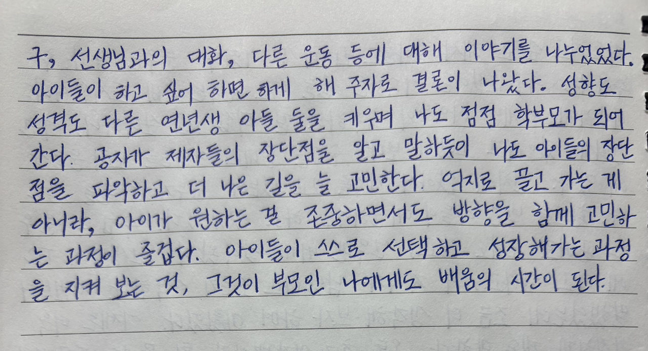 앞서서 남편과도 아이들의 축구, 선생님과의 대화, 다른 운동 등에 대해 이야기를 나누었었다.