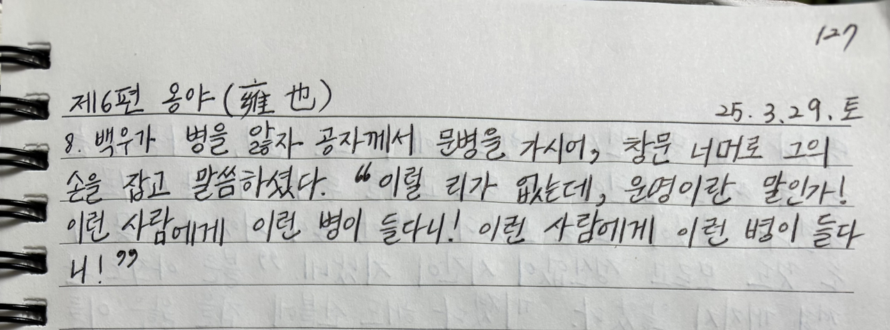 백우가 병을 앓자 공자께서 문병을 가시어, 창문 너머로 그의 손을 잡고 말씀하셨다. "이럴 리가 없는데, 운명이란 말인가! 이런 사람에게 이런 병이 들다니! 이런 사람에게 이런 병이 들다니!"