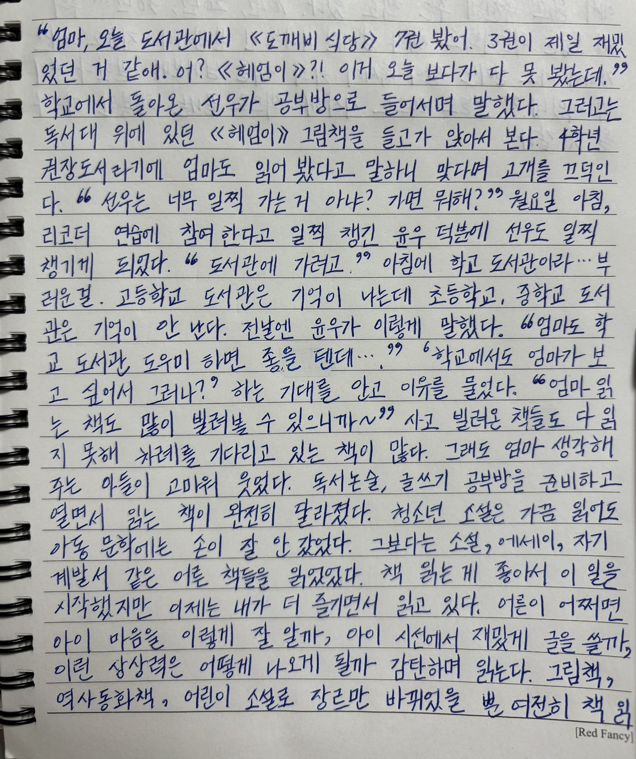 "엄마, 오늘 도서관에서 《도깨비 식당》 7권 봤어. 3권이 제일 재밌었던 거 같애. 어? 《헤엄이》?! 이거 오늘 보다가 다 못 봤는데."