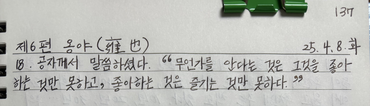 공자께서 말씀하셨다. “무언가를 안다는 것은 그것을 좋아하는 것만 못하고, 좋아하는 것은 즐기는 것만 못하다.”