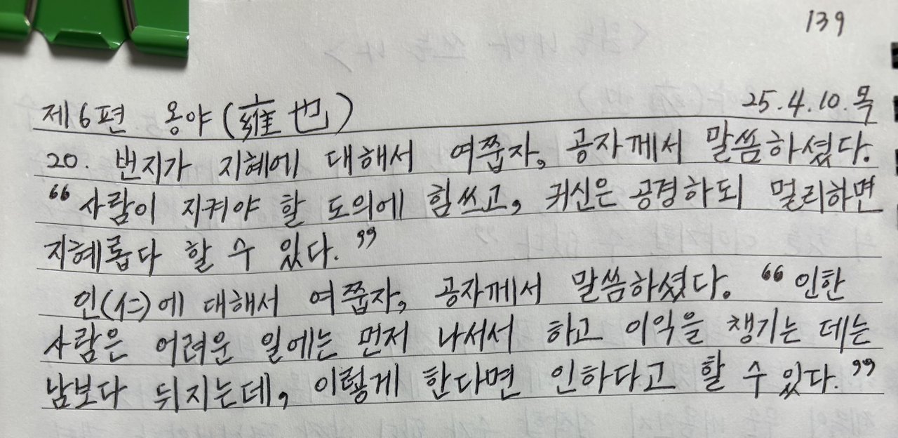 번지가 지혜에 대해서 여쭙자, 공자께서 말씀하셨다. “사람에 지켜야 할 도의에 힘쓰고, 귀신은 공경하되 멀리하면 지혜롭다 할 수 있다.”