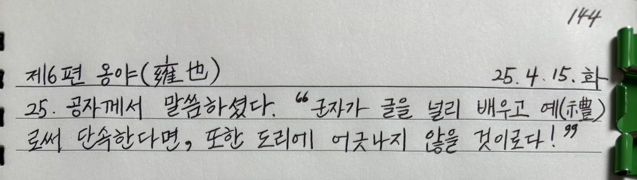 공자께서 말씀하셨다. “군자가 글을 널리 배우고 예(禮)로써 단속한다면, 또한 도리에 어긋나지 않을 것이로다!”