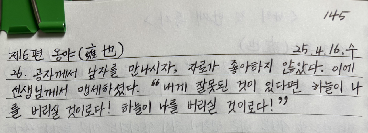 공자께서 남자를 만나시자, 자로가 좋아하지 않았다. 이에 선생님께서 맹세하셨다. “내게 잘못된 것이 있다면 하늘이 나를 버리실 것이로다! 하늘이 나를 버리실 것이로다!”