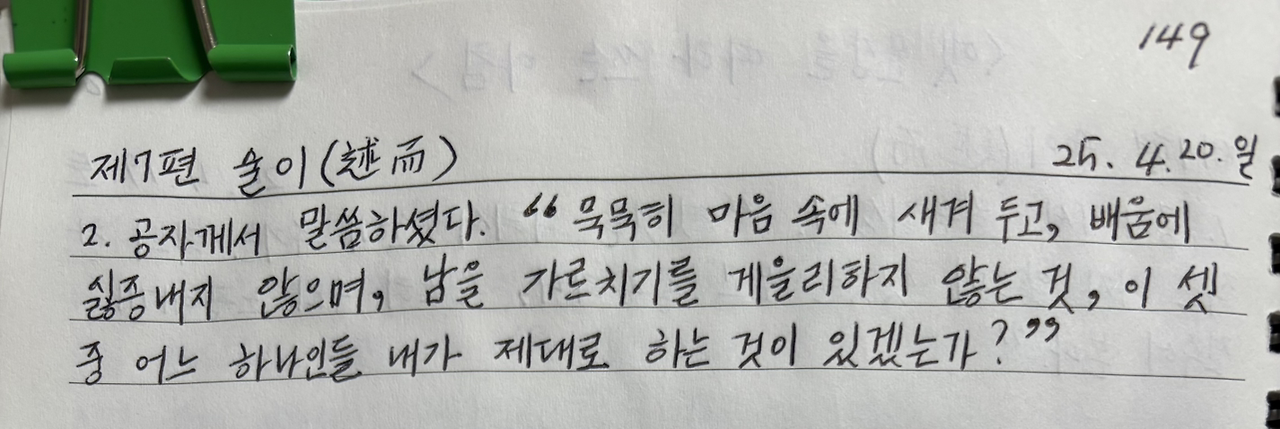 "묵묵히 마음속에 새겨 두고, 배움에 싫증 내지 않으며, 남을 가르치기를 게을리하지 않는 것, 이 셋 중 어느 하나인들 내가 제대로 하는 것이 있겠는가?"