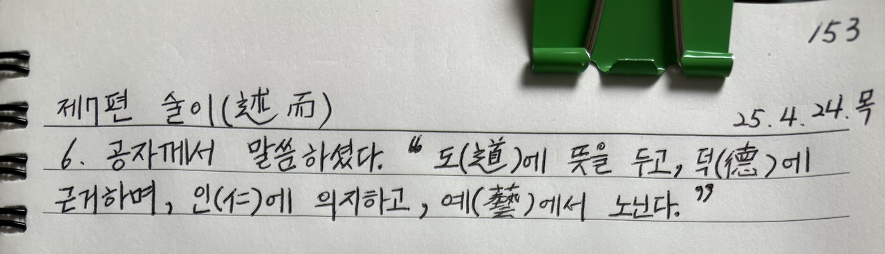 공자께서 말씀하셨다. "도(道)에 뜻을 두고, 덕(德)에 근거하며, 인(仁)에 의지하고, 예(藝)에서 노닌다."