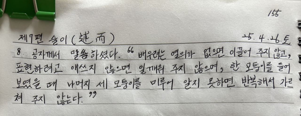 공자께서 말씀하셨다. “배우려는 열의가 없으면 이끌어 주지 않고, 표현하려고 애쓰지 않으면 일깨워 주지 않으며, 한 모퉁이를 들어 보였을 때 나머지 세 모퉁이를 미루어 알지 못하면 반복해서 가르쳐 주지 않는다.”