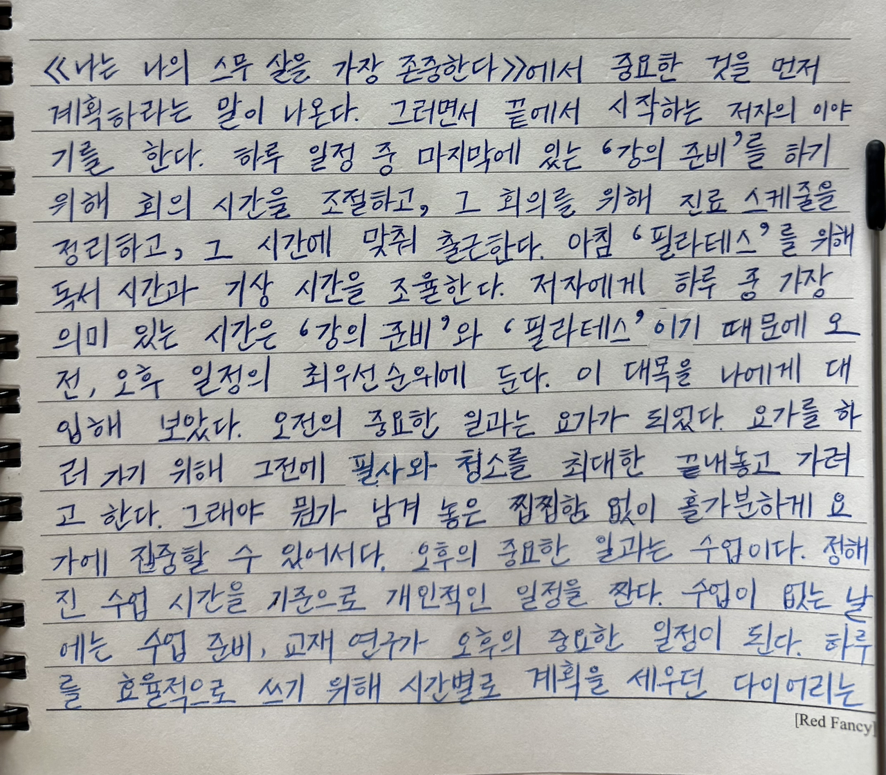 저자에게 하루 중 가장 의미 있는 시간은 ‘강의 준비’와 ‘필라테스’이기 때문에 오전, 오후 일정의 최우선순위에 둔다.