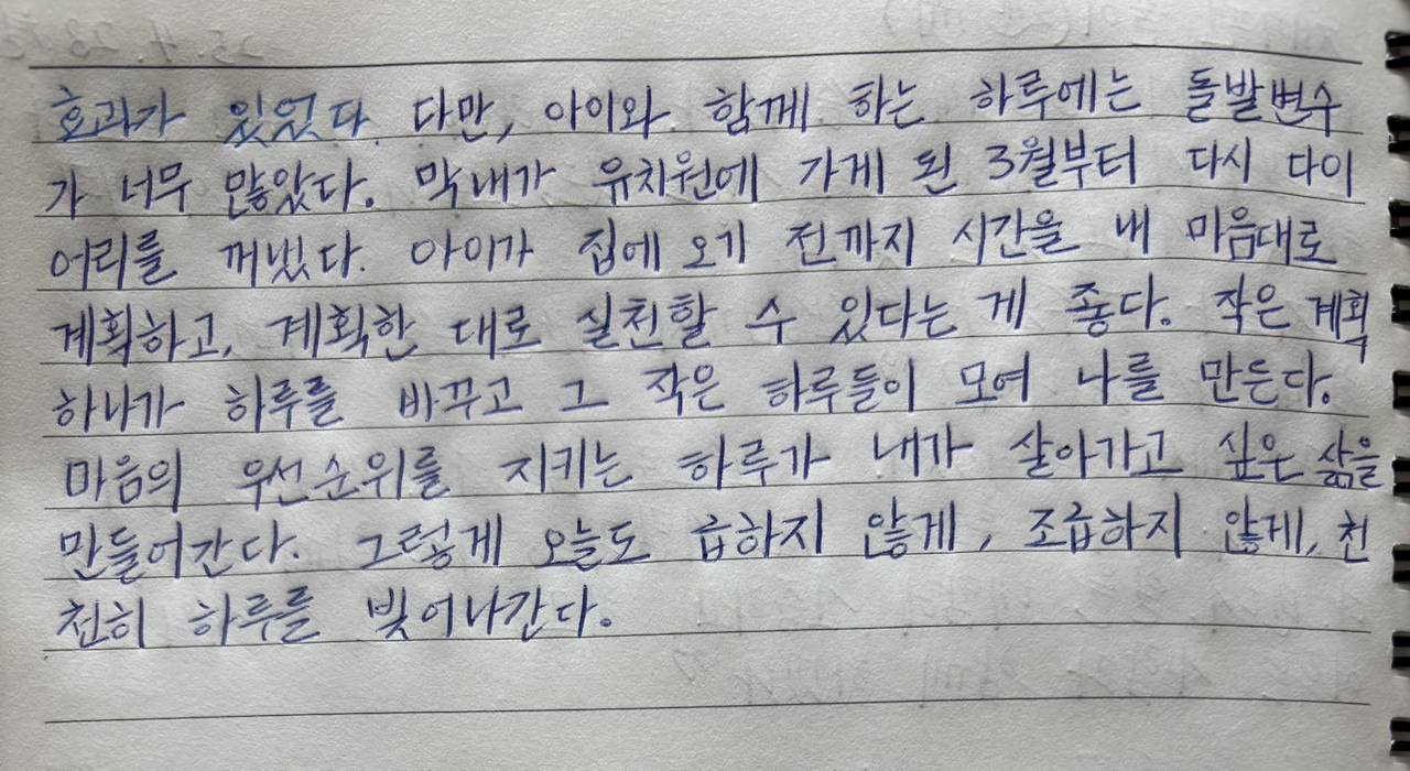 아이가 집에 오기 전까지 시간을 내 마음대로 계획하고, 계획한 대로 실천할 수 있다는 게 좋다.