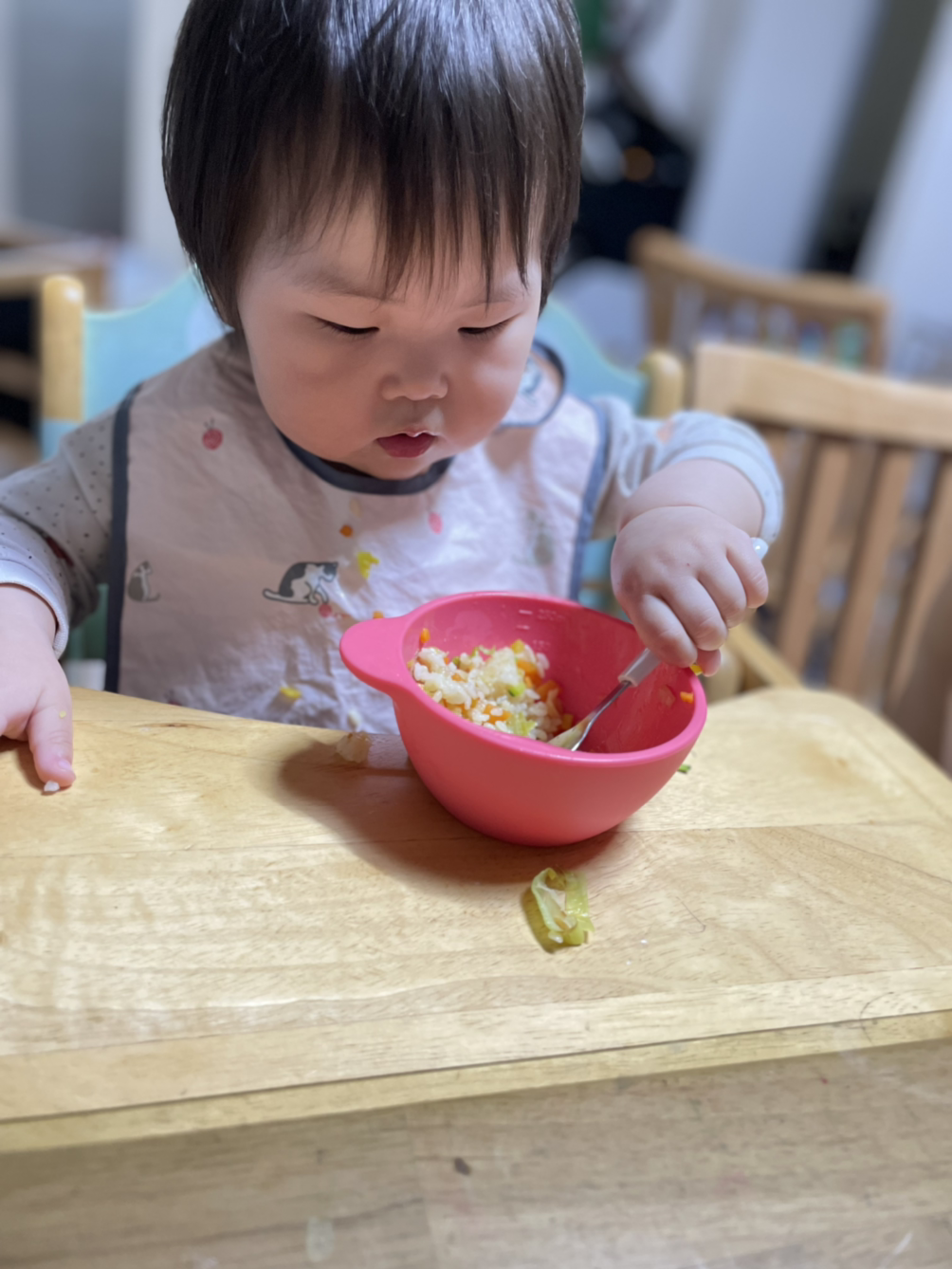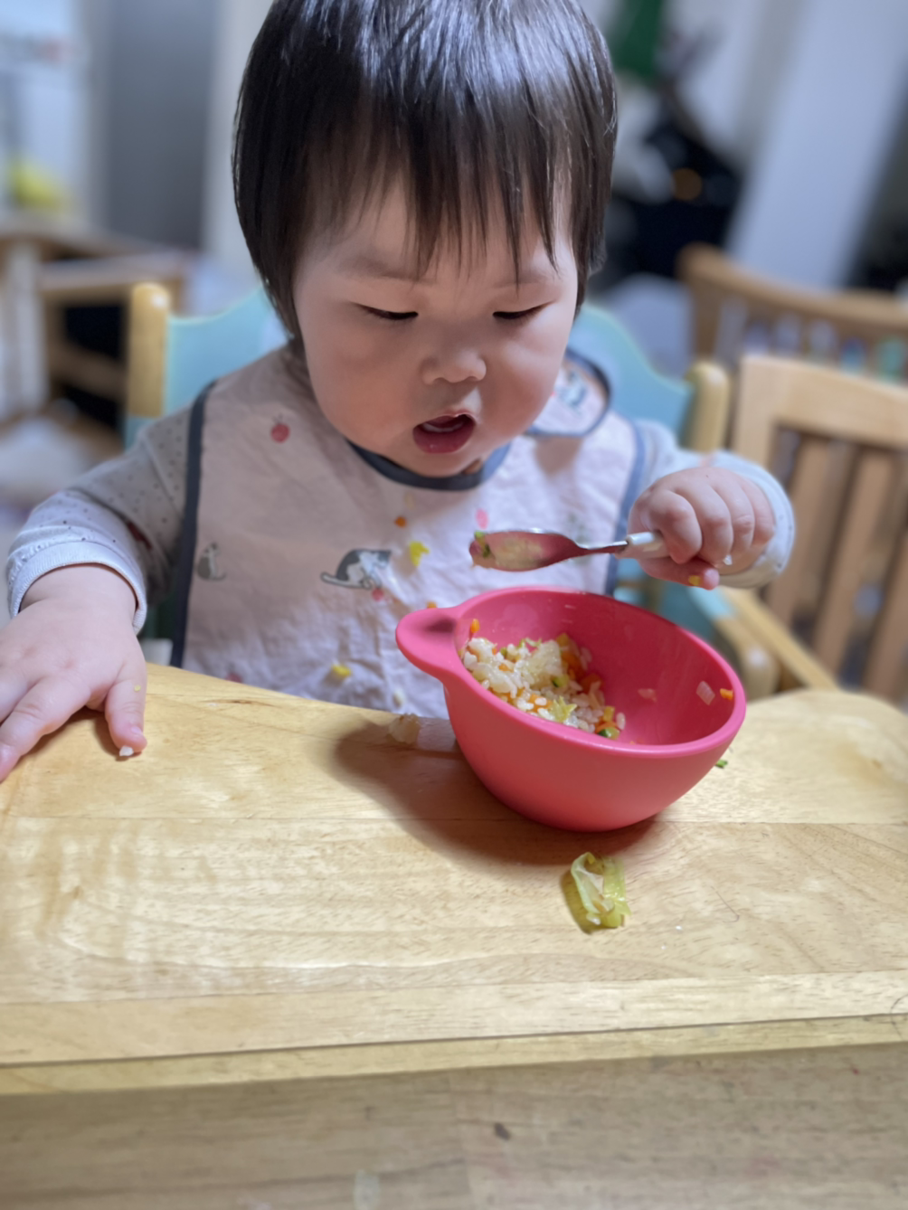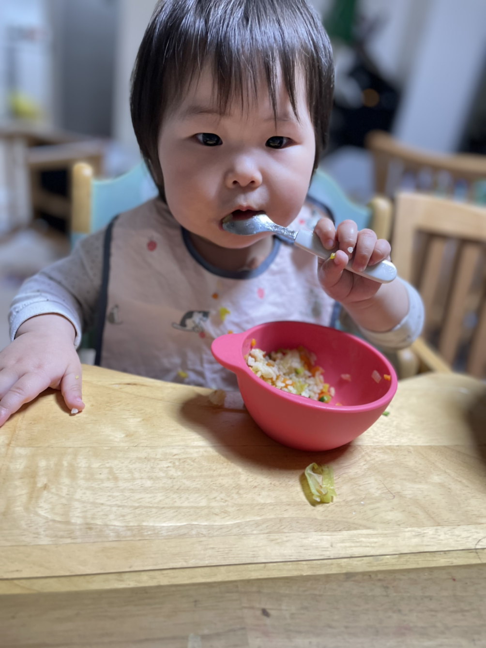 앞에서 보니 은서가 숟가락으로 밥을 먹고 있다.