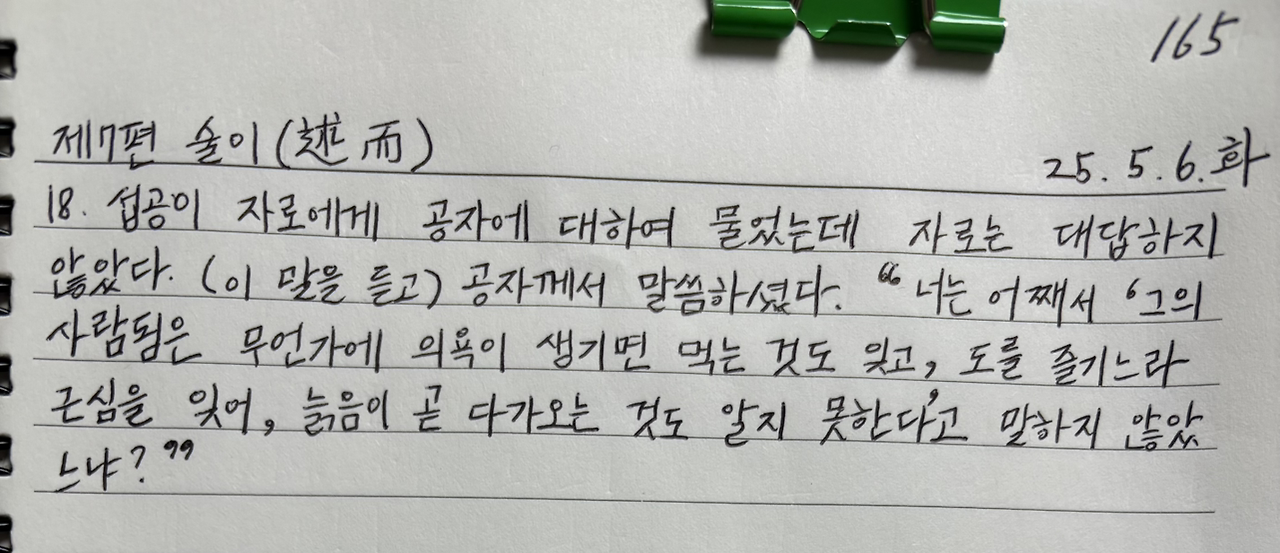 섭공이 자로에게 공자에 대하여 물었는데 자로는 대답하지 않았다. (이 말을 듣고) 공자께서 말씀하셨다. "너는 어째서 '그의 사람됨은 무언가에 의욕이 생기면 먹는 것도 잊고, 도를 즐기느라 근심을 잊어, 늙음이 곧 다가오는 것도 알지 못한다'고 말하지 않았느냐?"