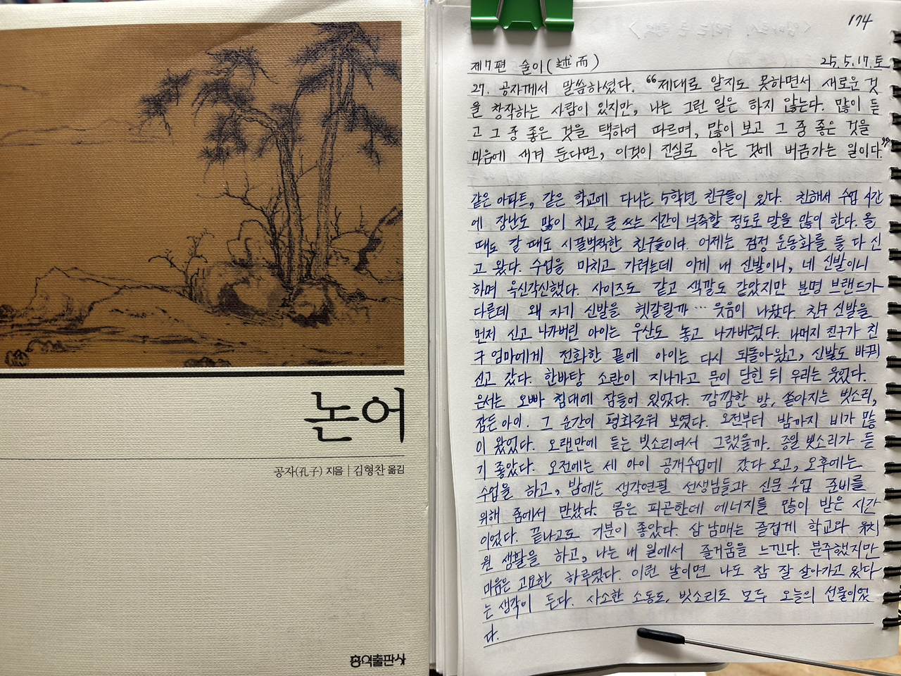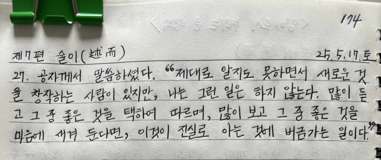 공자께서 말씀하셨다. "제대로 알지도 못하면서 새로운 것을 창작하는 사람이 있지만, 나는 그런 일은 하지 않는다. 많이 듣고 그 중 좋은 것을 택하여 따르며, 많이 보고 그 중 좋은 것을 마음에 새겨 둔다면, 이것이 진실로 아는 것에 버금가는 일이다."