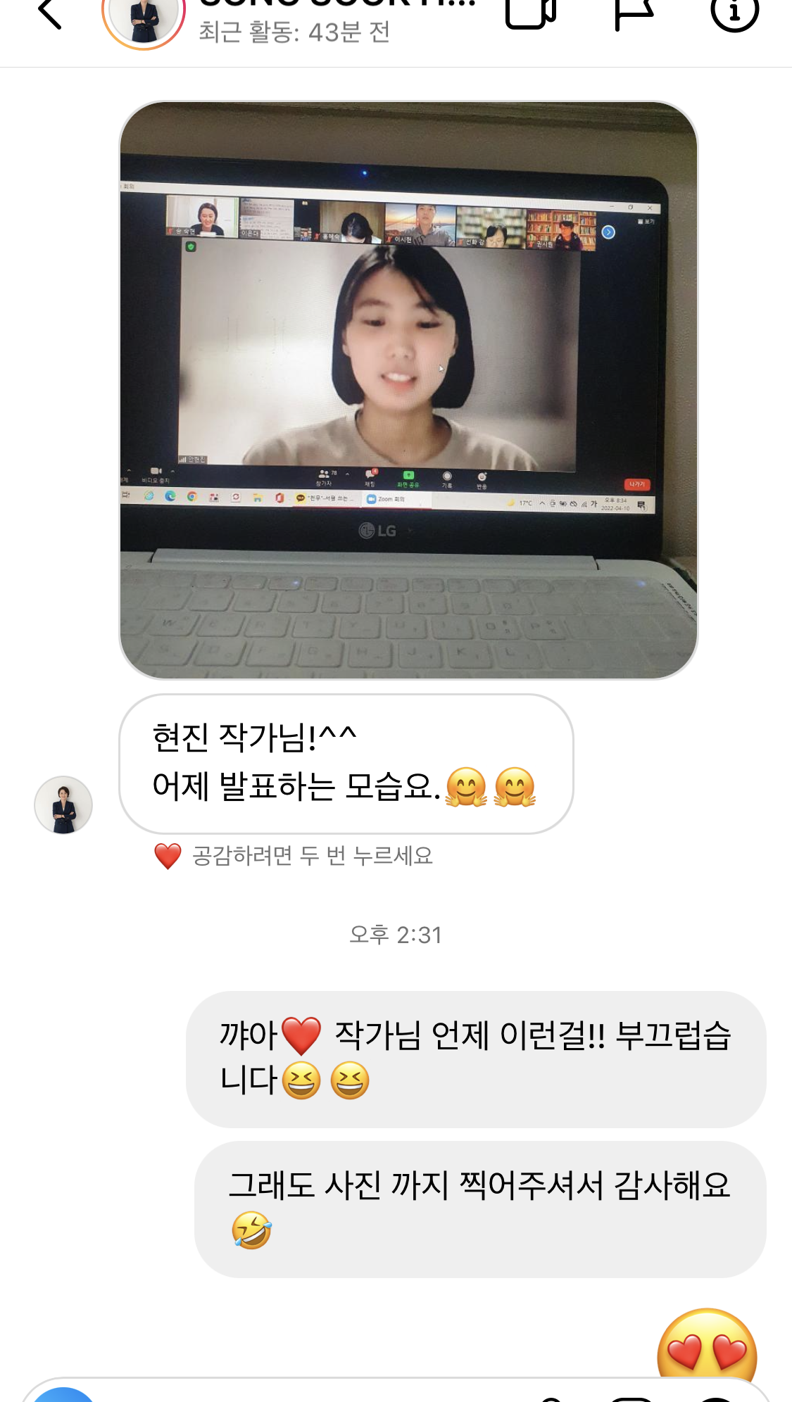 남편도 “현진아~” 이름을 부르고, 글쓰기 수업을 통해 알게 된 분들은 서로를 00 작가님이라 부른다.