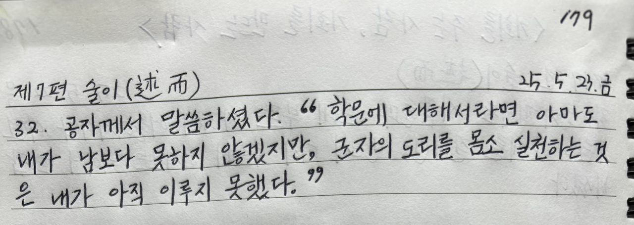 공자께서 말씀하셨다. “학문에 대해서라면 아마도 내가 남보다 못하지 않겠지만, 군자의 도리를 몸소 실천하는 것은 내가 아직 이루지 못했다.”