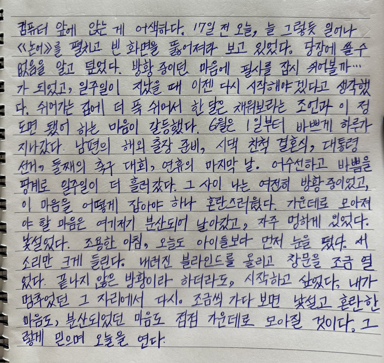 방황 중이던 마음에 필사를 잠시 쉬어볼까… 가 되었고, 일주일이 지났을 때 이젠 다시 시작해야겠다고 생각했다.