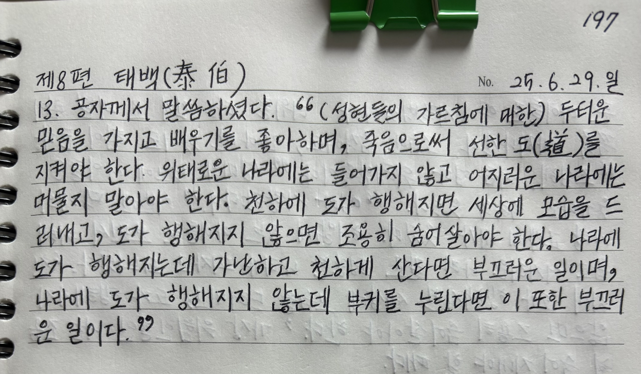 공자께서 말씀하셨다. "(성현들의 가르침에 대한) 두터운 믿음을 가지고 배우기를 좋아하며, 죽음으로써 선한 도(道)를 지켜야 한다. 위태로운 나라에는 들어가지 않고 어지러운 나라에는 머물지 말아야 한다. 천하에 도가 행해지면 세상에 모습을 드러내고, 도가 행해지지 않으면 조용히 숨어 살아야 한다. 나라에 도가 행해지는데 가난하고 천하게 산다면 부끄러운 일이며, 나라에 도가 행해지지 않는데 부귀를 누린다면 이 또한 부끄러운 일이다."