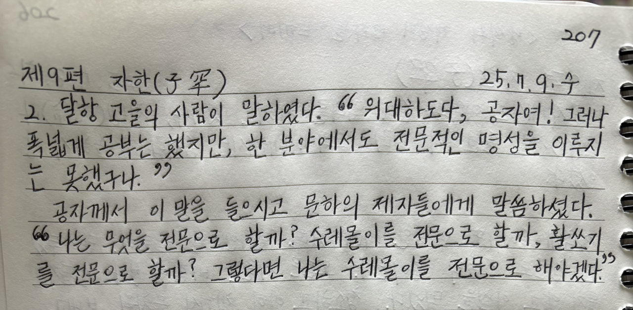 공자께서 이 말을 들으시고 문하의 제자들에게 말씀하셨다. “나는 무엇을 전문으로 할까? 수레몰이를 전문으로 할까, 활쏘기를 전문으로 할까? 그렇다면 나는 수레몰이를 전문으로 해야겠다.”
