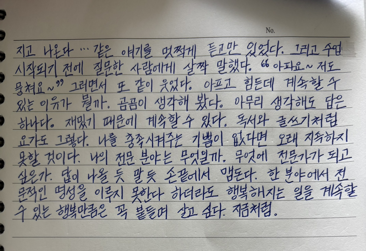 한 분야에서 전문적인 명성을 이루지 못한다 하더라도 행복해지는 일을 계속할 수 있는 행복만큼은 꼭 붙들며 살고 싶다.