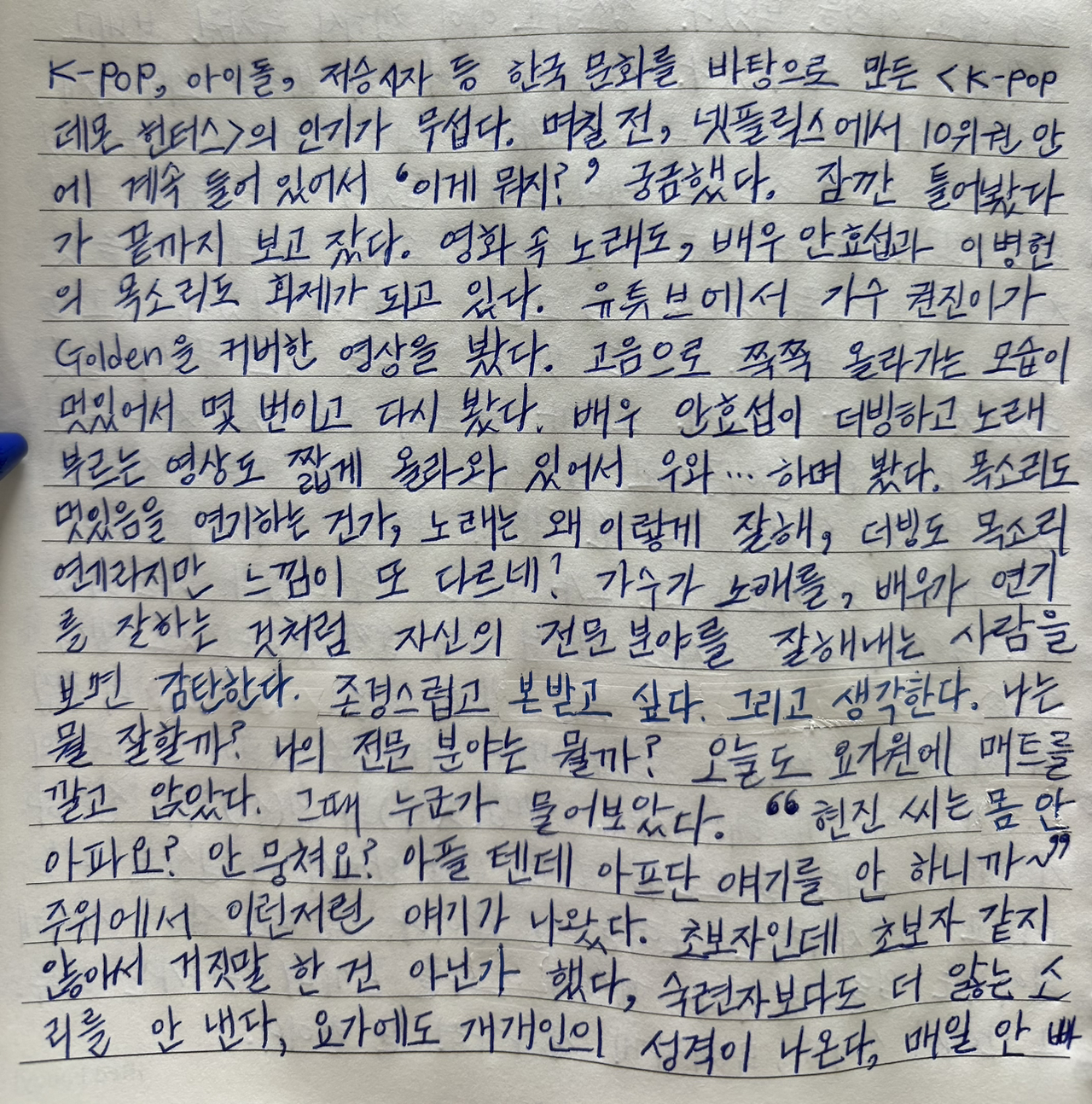 초보자인데 초보자 같지 않아서 거짓말 한 건 아닌가 했다, 숙련자보다도 더 앓는 소리를 안 낸다, 요가에도 개개인의 성격이 나온다, 매일 안 빠지고 나온다… 같은 얘기를 멋쩍게 듣고만 있었다.