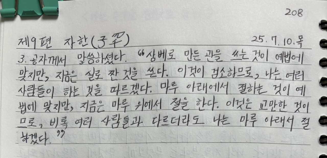 공자는 예법에 맞지 않지만 검소하기에 그것을 따르고, 예법에 맞지 않는 데다가 교만한 것은 여러 사람과 달라도 예법을 따르겠다고 했다.