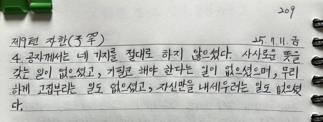 공자께서 하지 않은 네 가지를 눈으로 계속 읽었다.