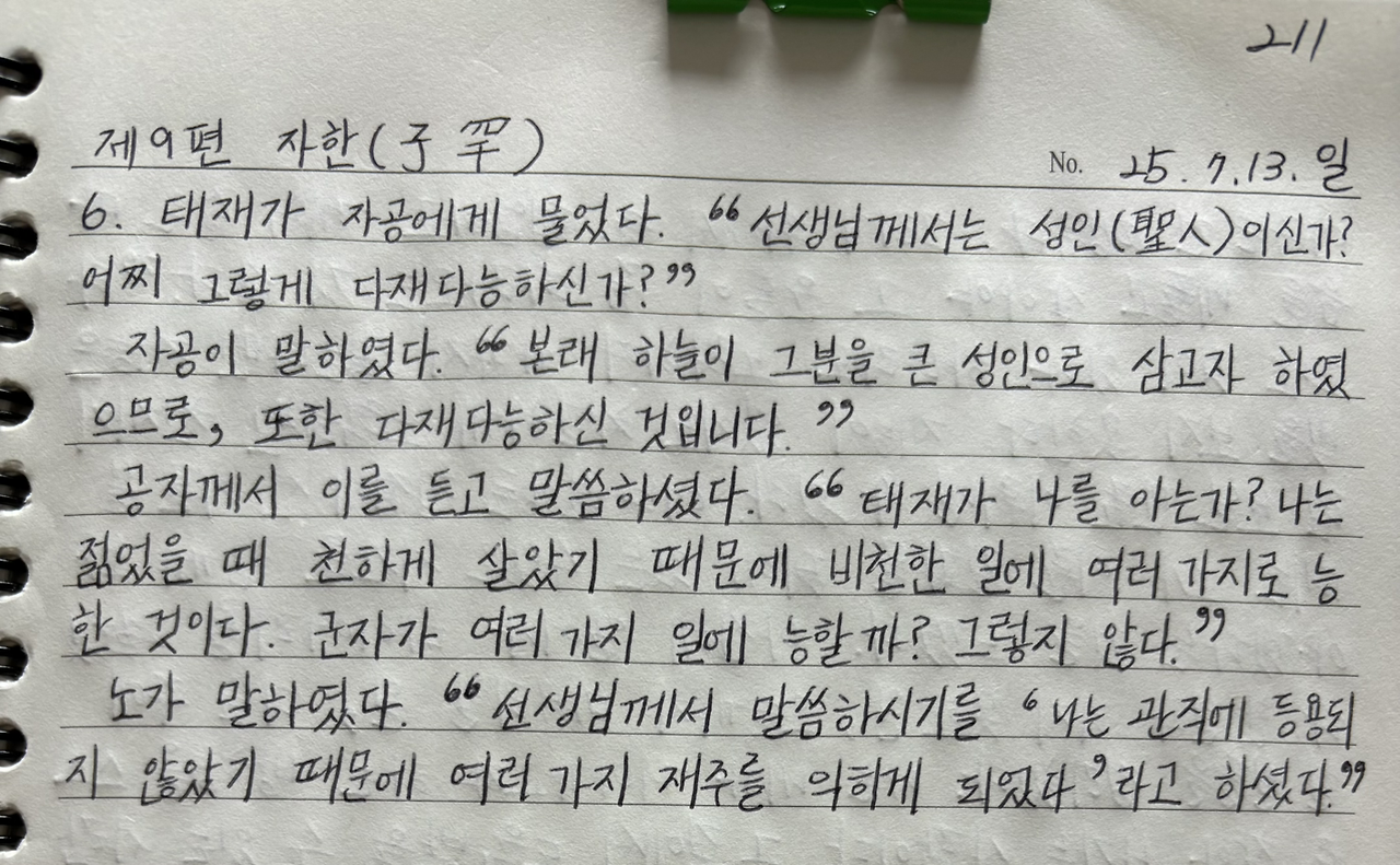 공자께서 이를 듣고 말씀하셨다. "태재가 나를 아는가? 나는 젊었을 때 천하게 살았기 때문에 비천한 일에 여러 가지로 능한 것이다. 군자가 여러 가지 일에 능할까? 그렇지 않다."
