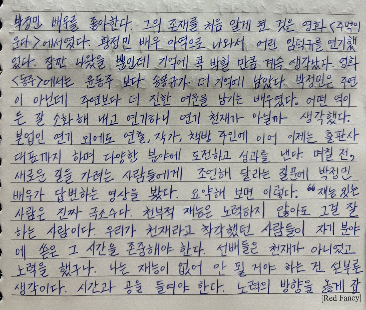 며칠 전, 새로운 길을 가려는 사람들에게 조언해 달라는 질문에 박정민 배우가 답변하는 영상을 봤다.