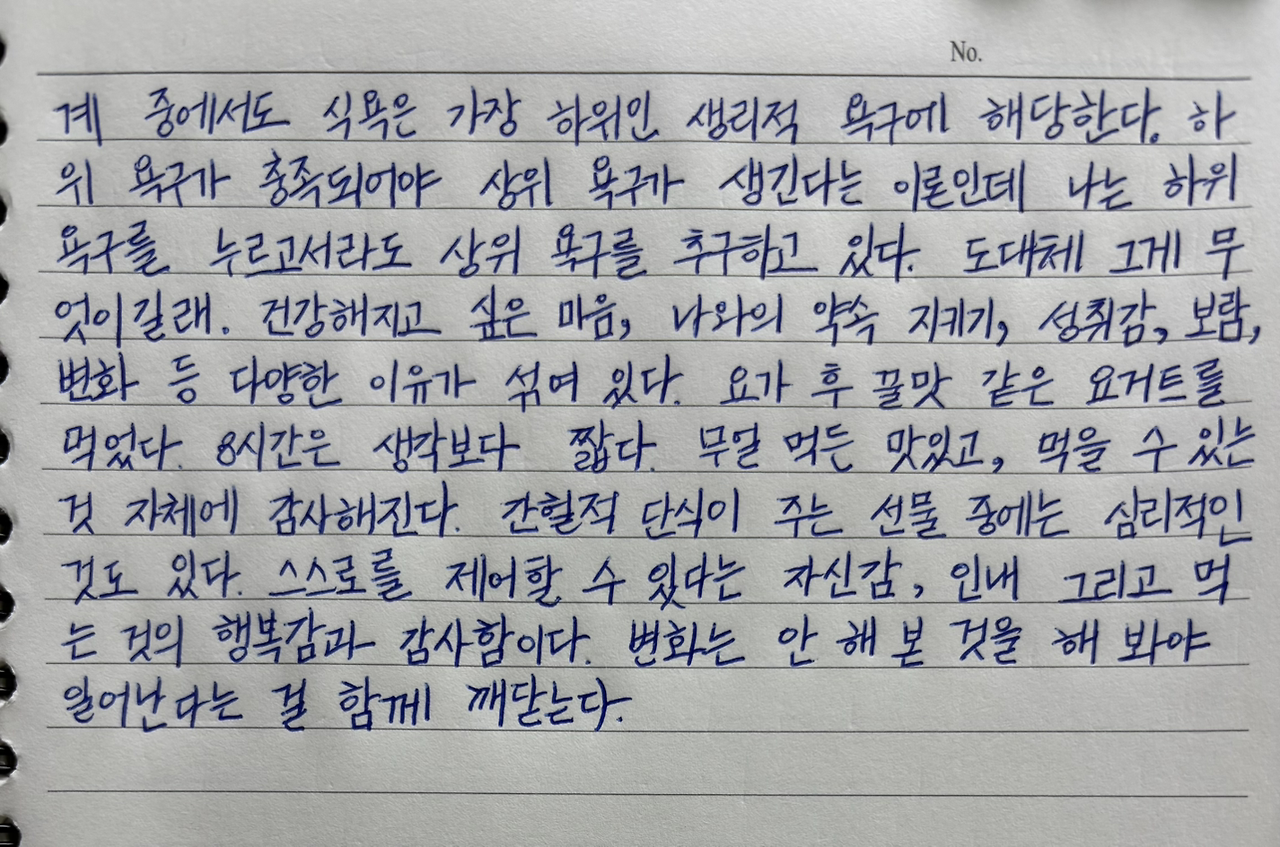 스스로를 제어할 수 있다는 자신감, 인내 그리고 먹는 것의 행복함과 감사함이다.