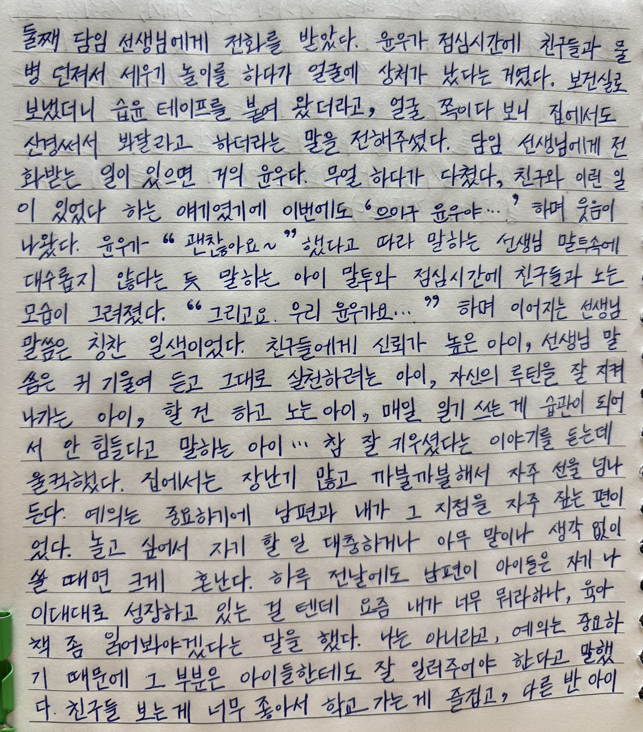 친구들에게 신뢰가 높은 아이, 선생님 말씀은 귀 기울여 듣고 그대로 실천하려는 아이, 자신의 루틴을 잘 지켜나가는 아이, 할 건 하고 노는 아이, 매일 일기 쓰는 게 습관이 되어서 안 힘들다고 말하는 아이… 참 잘 키우셨다는 이야기를 듣는데 울컥했다.