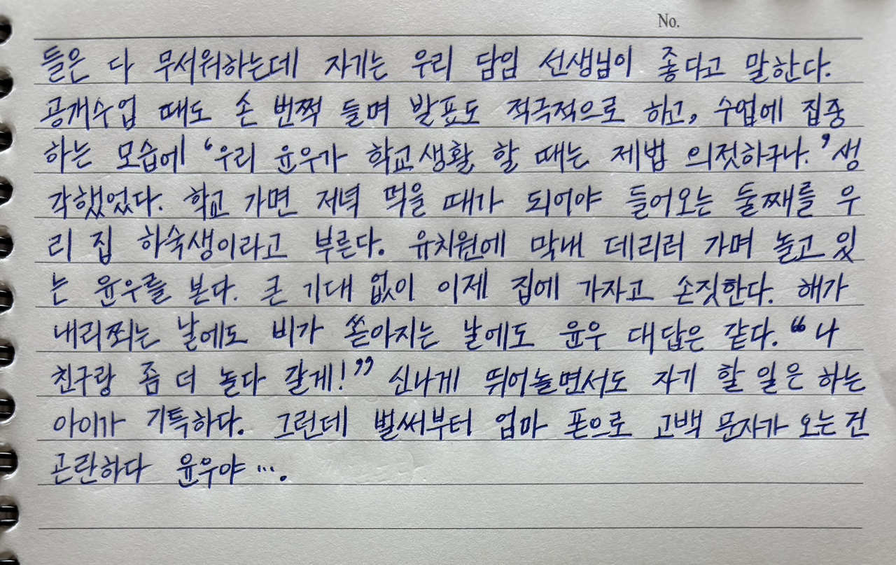 무얼 하다가 다쳤다, 친구와 이런 일이 있었다 하는 얘기였기에 이번에도 ‘으이구 윤우야….’ 하며 웃음이 나왔다.