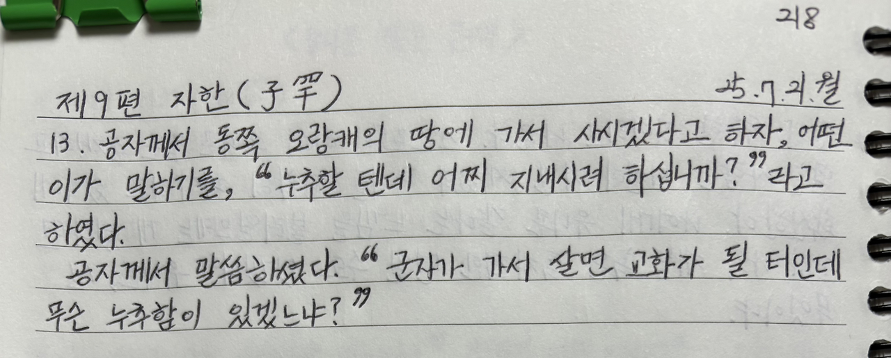 공자께서 동쪽 오랑캐의 땅에 가서 사시겠다고 하자, 어떤 이가 말하기를, "누추할 텐데 어찌 지내시려 하십니까?"라고 하였다.