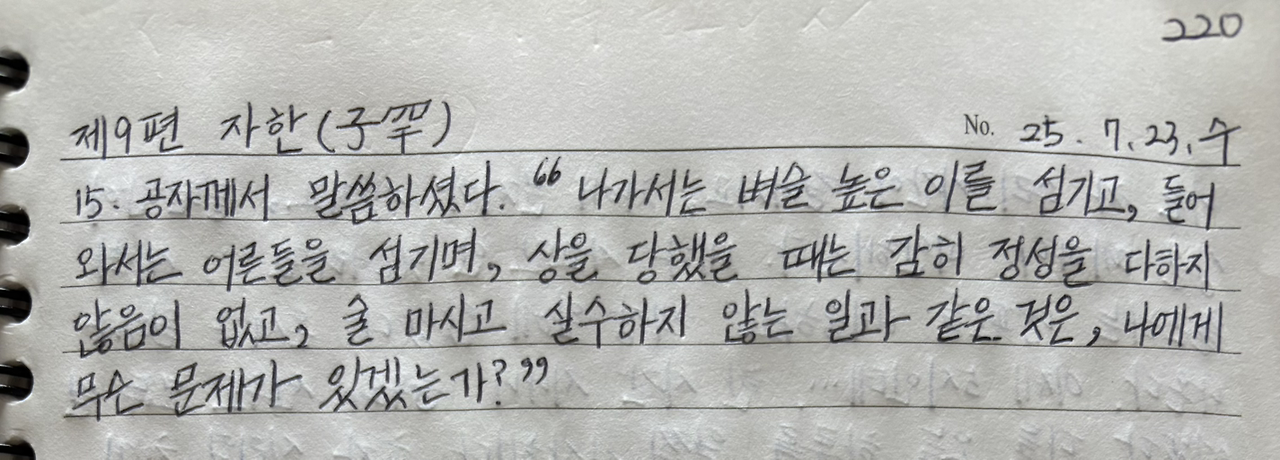 공자께서 말씀하셨다. “나가서는 벼슬 높은 이를 섬기고, 들어와서는 어른들을 섬기며, 상을 당했을 때는 감히 정성을 다하지 않음이 없고, 술 마시고 실수하지 않는 일과 같은 것은, 나에게 무슨 문제가 있겠는가?”