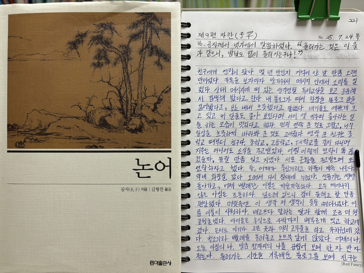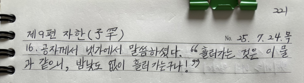 공자께서 냇가에서 말씀하셨다. “흘러가는 것은 이 물과 같으니, 밤낮도 없이 흘러가는구나!”