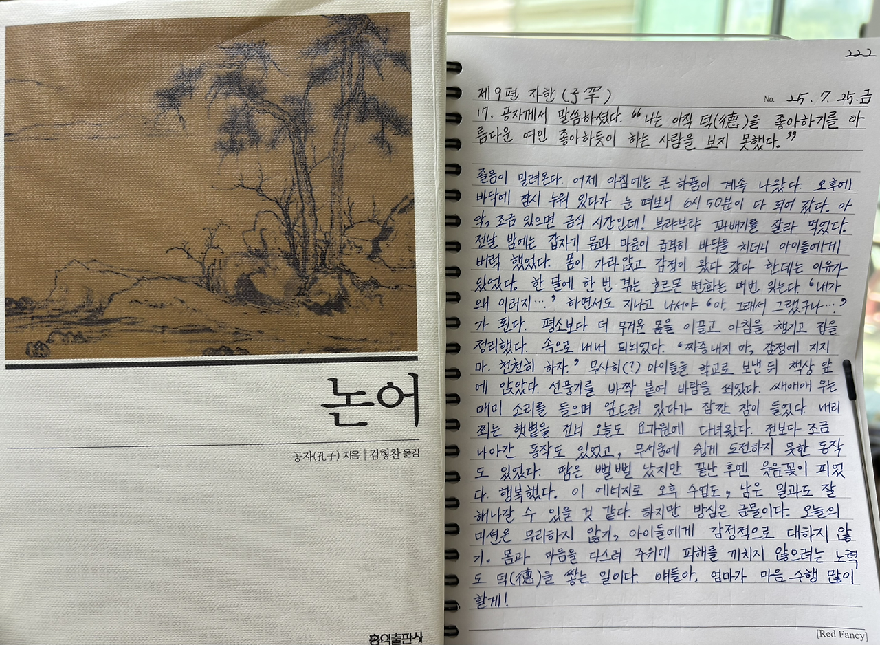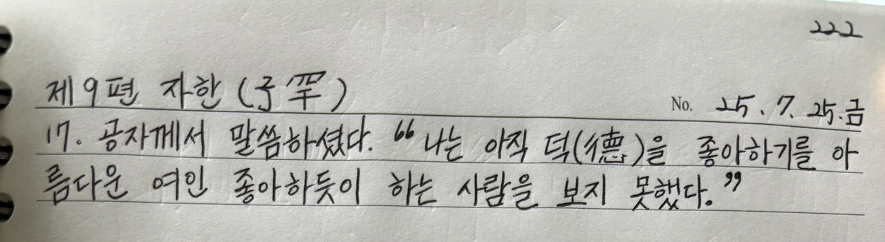 공자께서 말씀하셨다. "나는 아직 덕(德)을 좋아하기를 아름다운 여인 좋아하듯이 하는 사람을 보지 못했다."