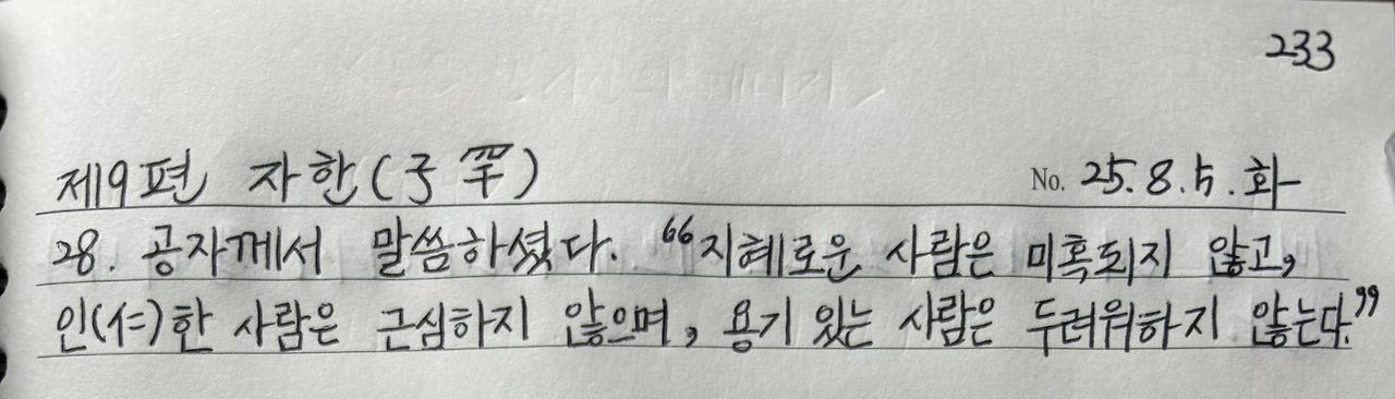 공자께서 말씀하셨다. "지혜로운 사람은 미혹되지 않고, 인(仁)한 사람은 근심하지 않으며, 용기 있는 사람은 두려워하지 않는다."