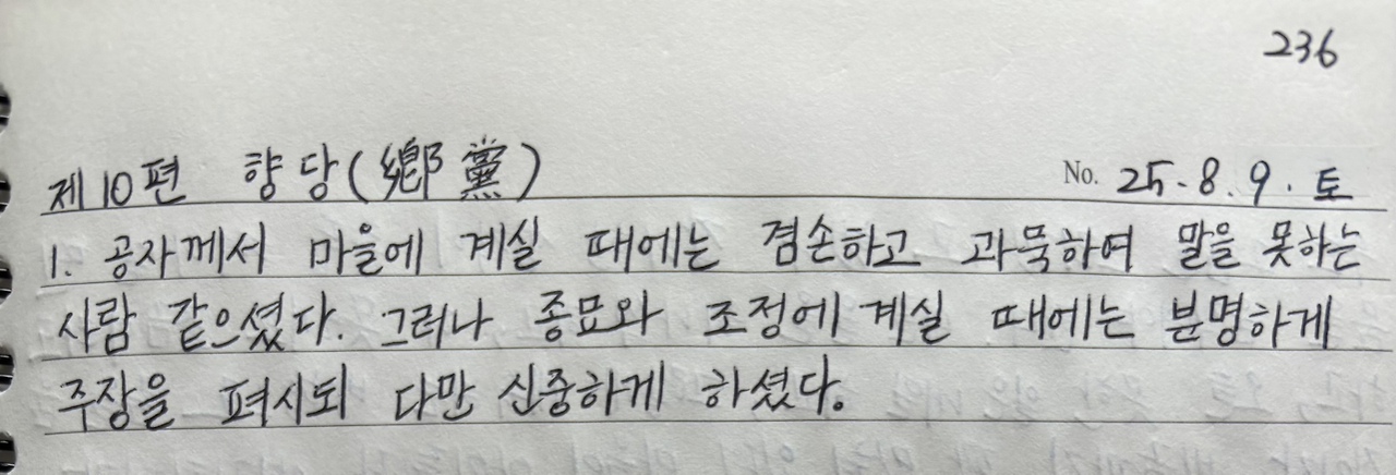 공자께서 마을에 계실 때에는 겸손하고 과묵하여 말을 못하는 사람 같으셨다. 그러나 종묘와 조정에 계실 때에는 분명하게 주장을 펴시되 다만 신중하게 하셨다.