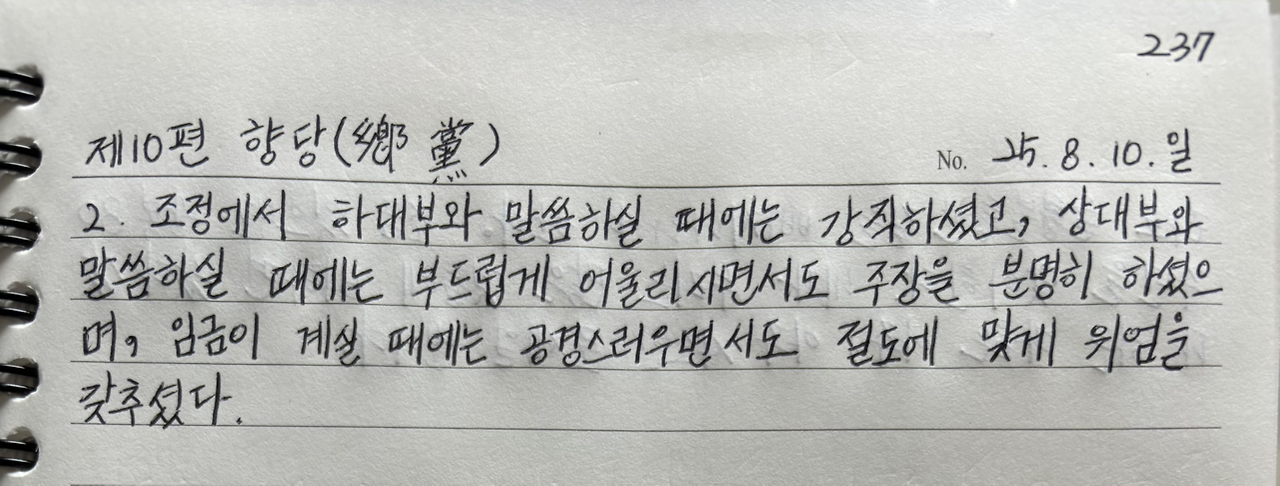 조정에서 하대부와 말씀하실 때에는 강직하셨고, 상대부와 말씀하실 때에는 부드럽게 어울리시면서도 주장을 분명히 하셨으며, 임금이 계실 때에는 공경스러우면서도 절도에 맞게 위엄에 갖추셨다.