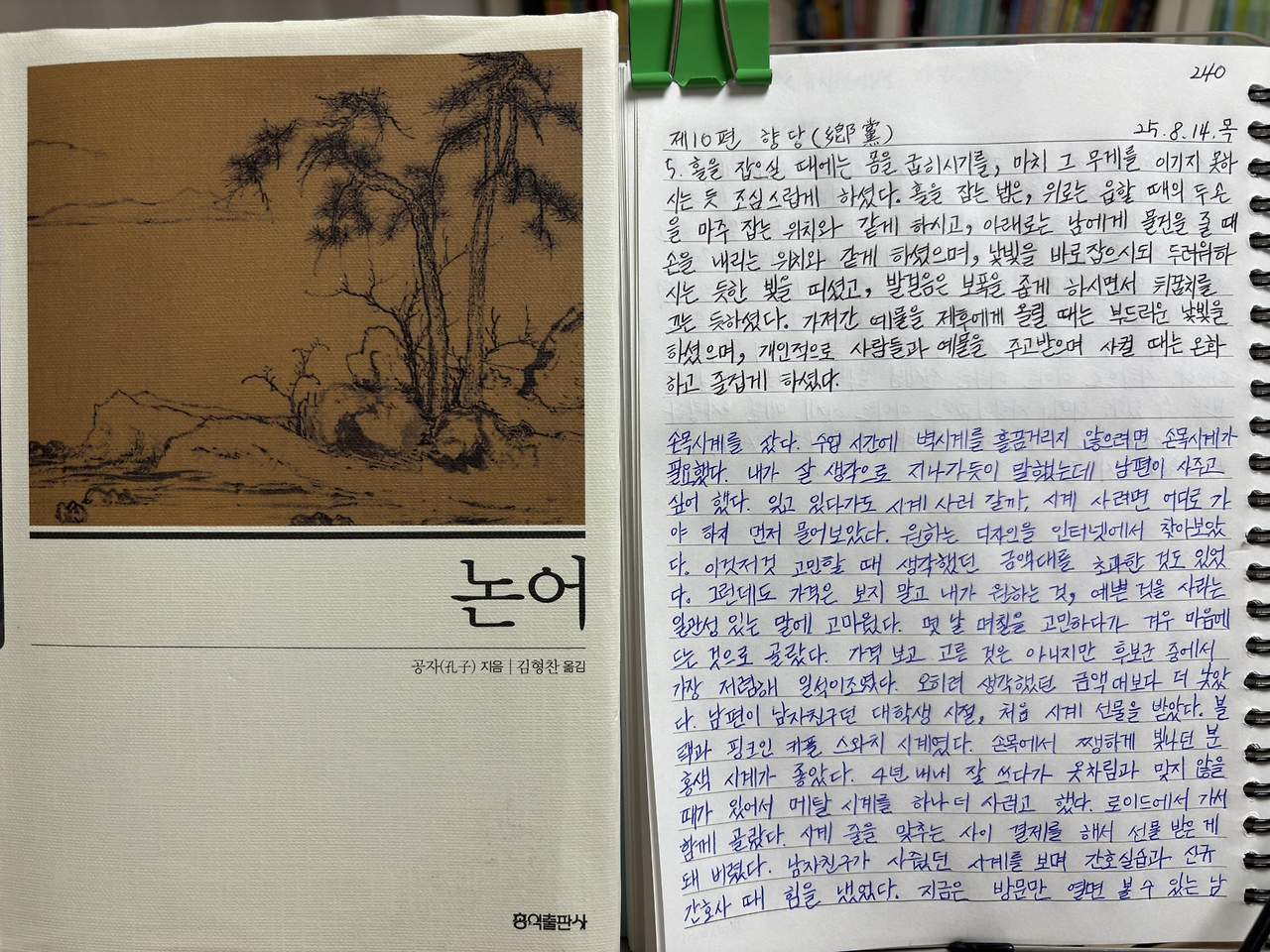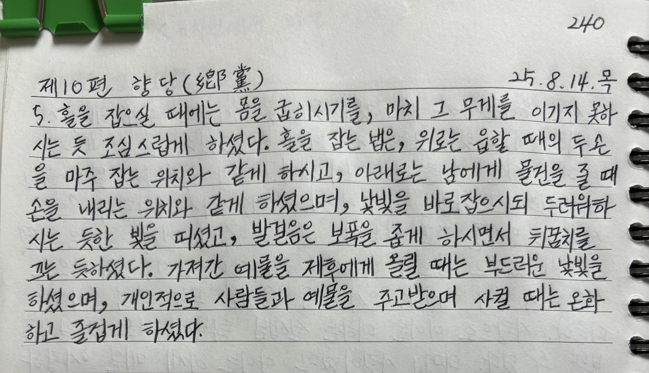 홀을 잡으실 때에는 몸을 굽히시기를, 마치 그 무게를 이기지 못하시는 듯 조심스럽게 하셨다. 홀을 잡는 법은, 위로는 읍할 때의 두 손을 마주 잡는 위치와 같게 하시고, 아래로는 남에게 물건을 줄 때 손을 내리는 위치와 같게 하셨으며, 낯빛을 바로잡으시되 두려워하시는 듯한 빛을 띠셨고, 발걸음은 보폭을 좁게 하시면서 뒤꿈치를 끄는 듯하셨다. 가져간 예물을 제후에게 올릴 때는 부드러운 낯빛을 하셨으며, 개인적으로 사람들과 예물을 주고받으며 사귈 때는 온화하고 즐겁게 하셨다.
