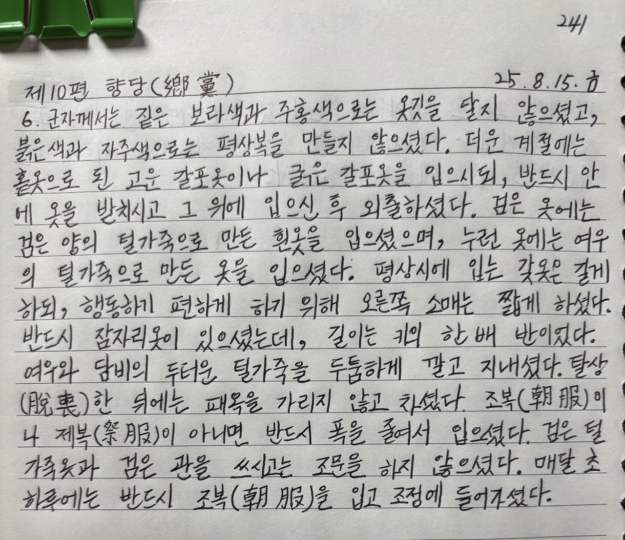 군자께서는 짙은 보라색과 주홍색으로는 옷깃을 달지 않으셨고, 붉은색과 자주색으로는 평상복을 만들지 않으셨다. 더운 계절에는 홑옷으로 된 고운 갈포옷이나 굵은 갈포옷을 입으시되, 반드시 안에 옷을 받치시고 그 위에 입으신 후 외출하셨다. 검은 옷에는 검은 양의 털가죽으로 만든 옷을 입으시고, 흰 옷에는 새끼 사슴의 털가죽으로 만든 흰옷을 입으셨으며, 누런 옷에는 여우의 털가죽으로 만든 옷을 입으셨다. 평상시에 입는 갖옷은 길게 하되, 행동하기 편하게 하기 위해 오른쪽 소매는 짧게 하셨다. 반드시 잠자리옷이 있으셨는데, 길이는 키의 한 배 반이었다. 여우와 담비의 두터운 털가죽을 두툼하게 깔고 지내셨다. 탈상한 뒤에는 패옥을 가리지 않고 차셨다. 조복이나 제복이 아니면 반드시 폭을 줄여서 입으셨다. 검은 털가죽옷과 검은 관을 쓰시고는 조문을 하지 않으셨다. 매달 초하루에는 반드시 조복을 입고 조정에 들어가셨다.