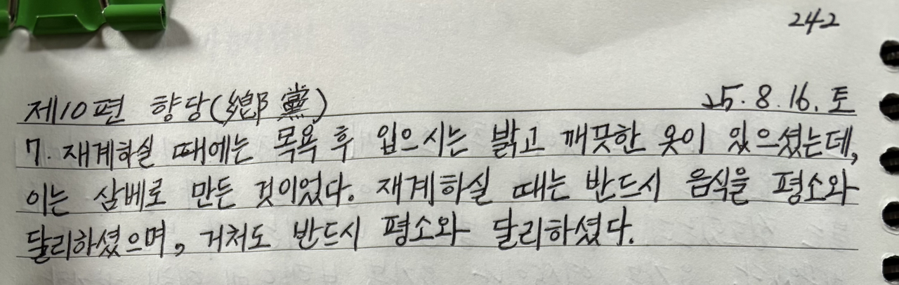 재계하실 때에는 목욕 후 입으시는 밝고 깨끗한 옷이 있으셨는데, 이는 삼베로 만든 것이었다. 재계하실 때는 반드시 음식을 평소와 달리하셨으며, 거처도 반드시 평소와 달리하셨다.