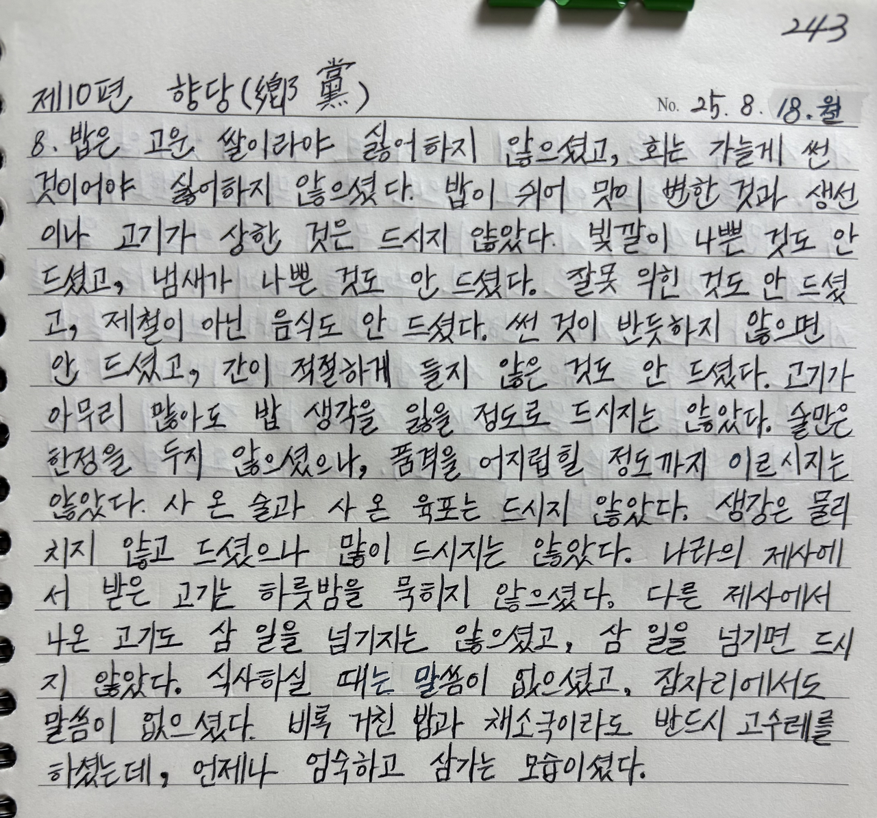 밥은 고운 쌀이라야 싫어하지 않으셨고, 회는 가늘게 썬 것이어야 싫어하지 않으셨다. 밥이 쉬어 맛이 변한 것과 생선이나 고기가 상한 것은 드시지 않았다. 빛깔이 나쁜 것도 안 드셨고, 냄새가 나쁜 것도 안 드셨다. 잘못 익힌 것도 안 드셨고, 제철이 아닌 음식도 안 드셨다. 썬 것이 반듯하지 않으면 안 드셨고, 간이 적절하게 들지 않은 것도 안 드셨다. 고기가 아무리 많아도 밥 생각을 잃을 정도로 드시지는 않았다. 술만은 한정을 두지 않으셨으나, 품격을 어지럽힐 정도까지 이르시지는 않았다. 사 온 술과 사 온 육포는 드시지 않았다. 생강은 물리치지 않고 드셨으나 많이 드시지는 않았다. 나라의 제사에서 받은 고기는 하룻밤을 묵히지 않으셨다. 다른 제사에서 나온 고기도 삼 일을 넘기지는 않으셨고, 삼 일을 넘기면 드시지 않았다. 식사하실 때는 말씀이 없으셨고, 잠자리에서도 말씀이 없으셨다. 비록 거친 밥과 채소국이라도 반드시 고수레를 하셨는데, 언제나 엄숙하고 삼가는 모습이셨다.