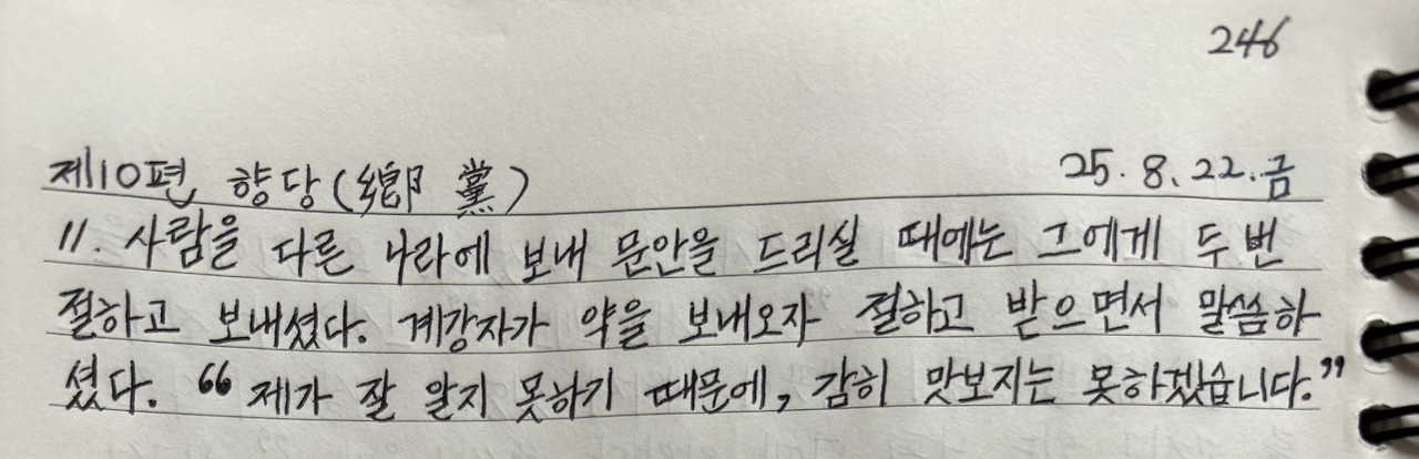 사람을 다른 나라에 보내 문안을 드리실 때에는 그에게 두 번 절하고 보내셨다. 계강자가 약을 보내오자 절하고 받으면서 말씀하셨다. "제가 잘 알지 못하기 때문에, 감히 맛보지는 못하겠습니다."